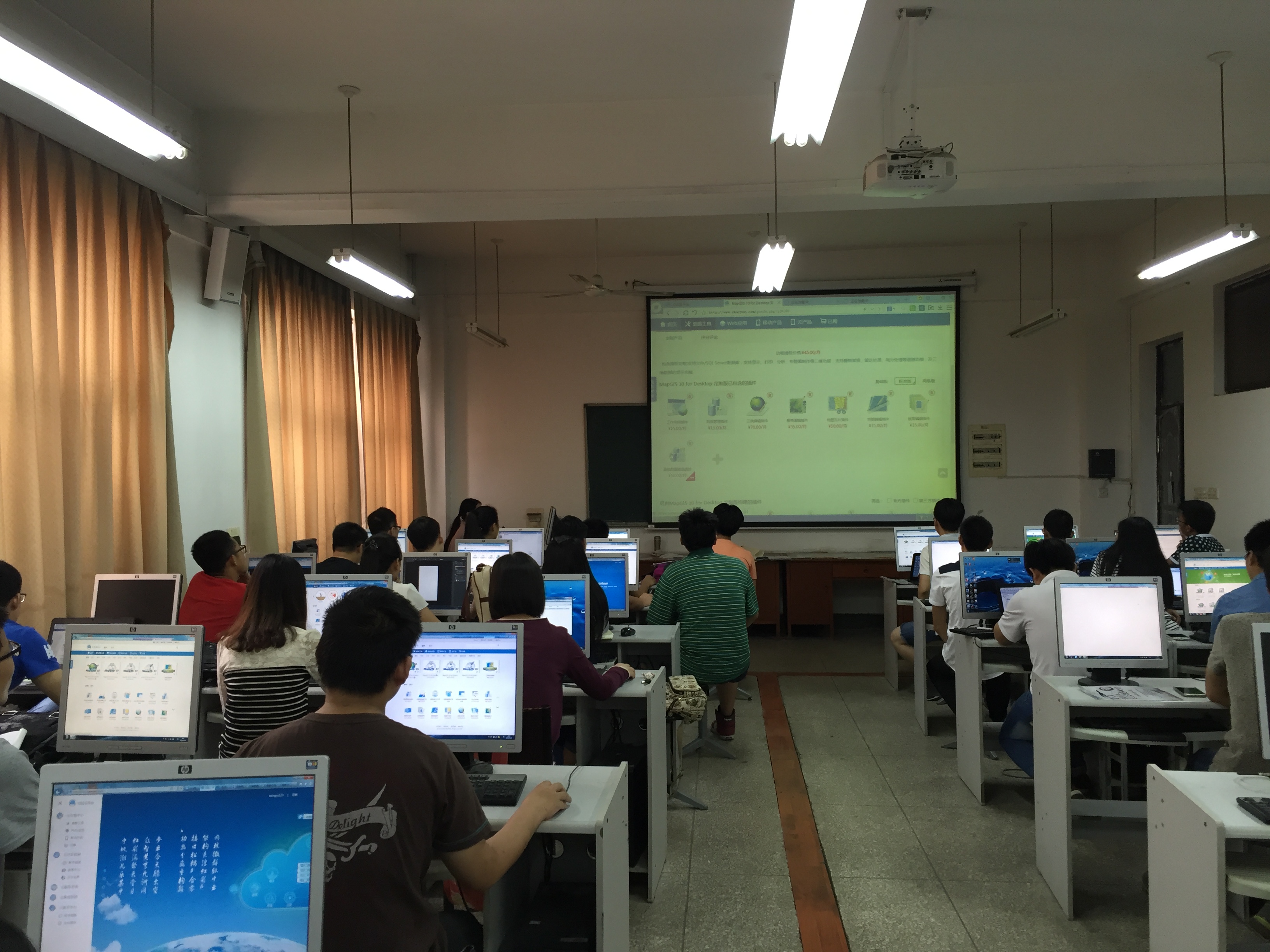 5月21日,全国高校GIS技能大赛组委会走进河南理工大学,开展为期两天的现场培训,理工大学文老师组织参赛学生参加了本次培训。大赛培训讲师对参赛学生进行了关于MapGIS K10软件基本操作的培训,详细讲解并演示了软件的安装使用流程,并重点介绍了矢量制图、遥感影像处理、三维建模等具体的软件操作方法。