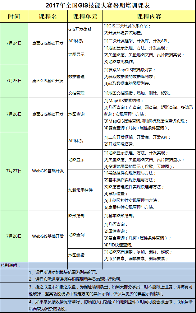 2017年第九届全国高校GIS技能大赛已经全面启动,为了帮助高校师生更加深入地了解GIS云平台架构理念和MapGIS 10软件的操作开发方式,武汉中地数码科技有限公司决定举办2017年暑期免费培训班。培训主要针对2017年第九届全国高校GIS技能大赛参赛组成员(参赛选手和指导老师),届时将由公司的培训讲师为大家授课。